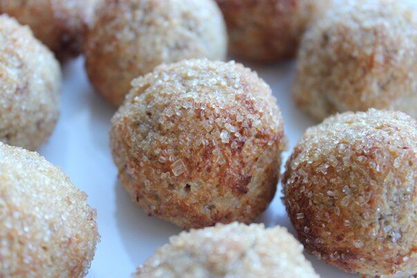 Смешать кокосовую стружку, сухое молоко и миндаль. Размять руками или с помощью блендера бананы, добавить к сухой смеси и замесить мягкое тесто. Смочить руки водой и скатать шарики. Обкатать шарики в сахаре кроме основания. Выложить на противень и выпекать в разогретой до 180С духовке 10-15 минут.