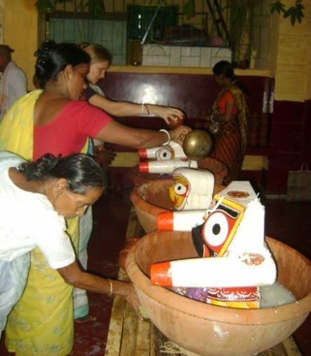 С божеств также смывается вся раскраска и их окрашивают заново. В день Ратха-ятры божества торжественно выносят из храма и помещают на колесницы, чтобы в сопровождении толпы верующих везти в храм Гундичи на т.н. Гундича-марджану.