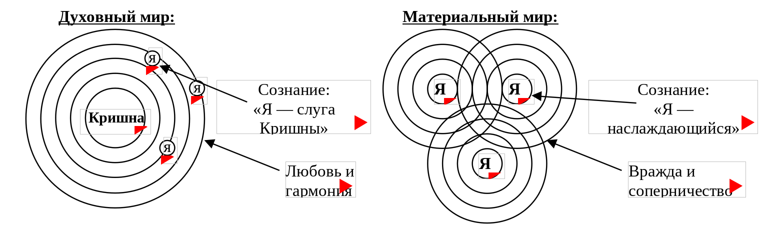 Таким образом, материальный мир — это мир где отношения основаны на вожделении, а духовный мир — это мир чистых, бескорыстных отношений, основанных на любви. В этом заключается основное различие между ними. Поскольку живое существо не может жить без расы, любовных взаимоотношений, вкус которых очень сладок, оно ищет именно этих отношений. Но проблема заключается в том, что, совершая роковую ошибку, живое существо принимает каму за прему, которые отличаются друг от друга также, как железо отличается от золота. Поэтому преданные Кришны рассматривают эту привязанность к материальным наслаждениям как форму страдания, ибо именно эта привязанность лишает человека решимости посвятить себя преданному служению Кришне и обрести прему — истинную безграничную любовь. Вот что об этом говорит Кришна в Бхагавад-Гите 2.44: