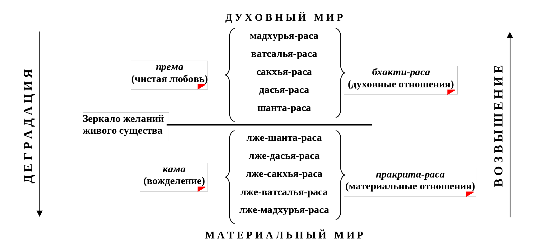 Каково отличие материального мира от духовного мира, и материальных отношений от духовных? Материальный мир является зеркальным отражением духовного мира. В нём изначальные духовные взаимоотношения (расы) проявляются извращенно и являются лишь бледным отражением этих истинных взаимоотношений. И, хотя отражение может быть очень похожим на реальный объект, тем не менее, оно лишь бледно напоминает о нём. Такое искажённое проявление любви называют кама — «вожделение».