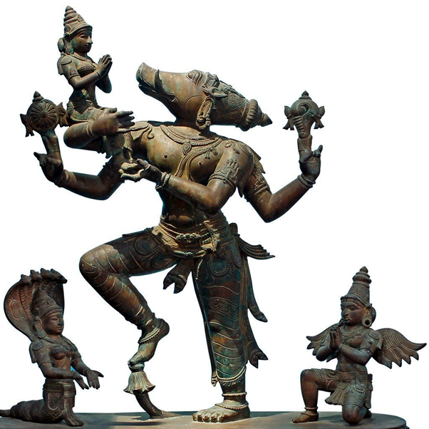 В приведенном выше мурти мы не получаем ни малейшего представления о том, что Земля – это разумное существо, подобное Самому Господу Варахе. Мурти Бху-Варахи предназначено для того, чтобы показать любовь между Варахой и Бху-деви и заботу Господа о Земле, но это чувство полностью отсутствует, когда Земля представлена как безличная сфера. Например, в приведенном ниже мурти мы видим победоносного Вараху, позирующего точно так же, как благородный рыцарь, спасающий беспомощную девицу. Мы также видим поклонение Бхуми-деви и восхваление ее спасителя и защитника.