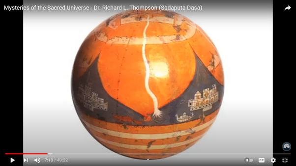 При ближайшем рассмотрении изображения, которые обычно преподносятся как свидетельство Земли в форме шара из Древней Индии, являются просто наложением современной концепции Земного шара на первоначальное ведическое учение, которое описывает Землю как плоскую и круглую. Показательным примером является нелепая попытка нанести Джамбудвипу, круглые острова и океаны Бху-мандалы на северное и южное полушария земного шара, представленная Садапутой дасом в его видео “Тайны священной Вселенной” и показанная на изображении ниже.