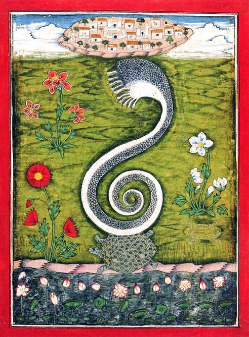 “Шеша несет весь мир, как диадему, на своей голове, и он является основанием, на котором покоятся семь Патал. Его сила, его слава, его форма, его природа не могут быть описаны, не могут быть поняты самими богами. Кто расскажет о его могуществе, кто носит всю эту Землю, как гирлянду цветов, окрашенную в пурпурный цвет сиянием драгоценных камней его гребней. Когда Ананта, закатив глаза от опьянения, зевает, тогда Земля со всеми ее лесами, горами, морями и реками дрожит… Земля, поддерживаемая на голове этого верховного змея, поддерживает, в свою очередь, гирлянду сфер вместе с их обитателями, людьми, демонами и богами.”