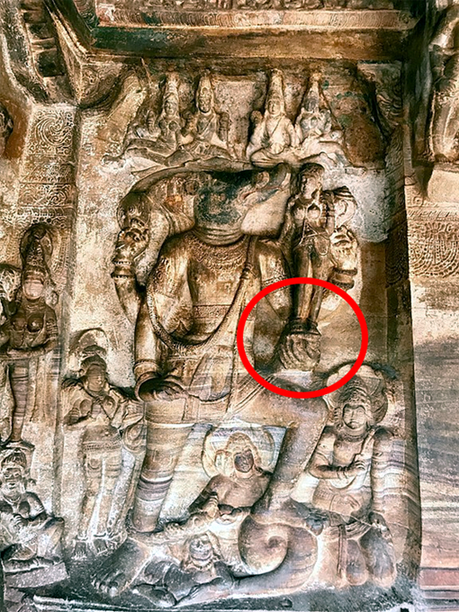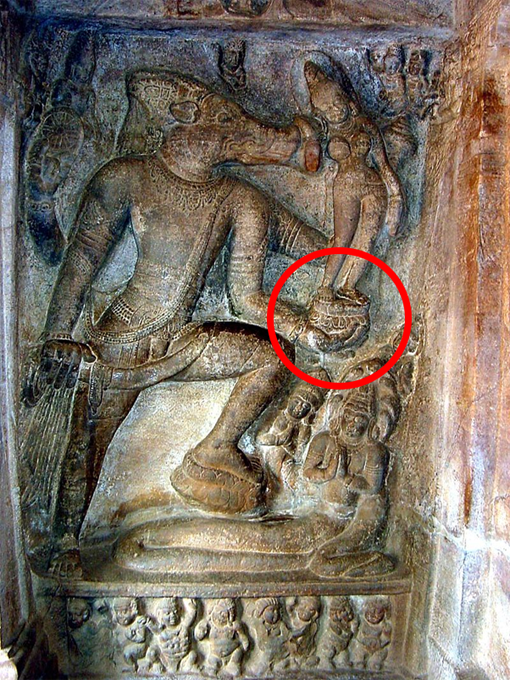 На изображении ниже мы можем видеть, как все черты Бху-Варахи, упомянутые Маркандеей Риши, изображены на этой скульптуре в пещерах Бадами в Карнатаке, Индия.