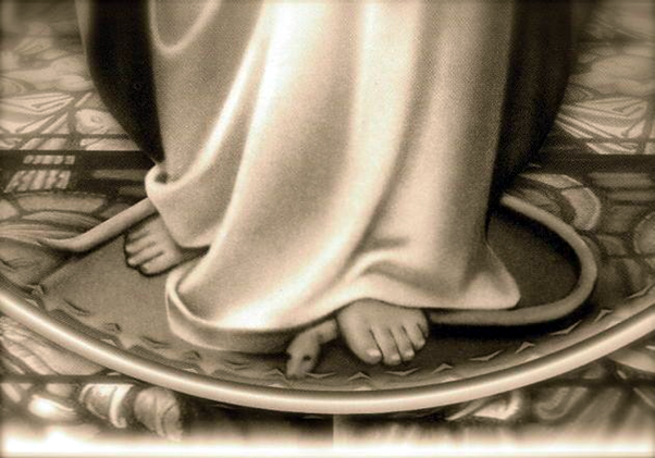 Обратите также внимание на приведенное выше изображение (и изображения, которые последуют за ним), как показано, что Вараха изображен с ногой на голове змеи. Змея, о которой идет речь, – это Ананта-шеша, изображенный в позе поклонения у лотосных стоп Господа Варахи. Хотя Вараха изображен с головой на ноге змеи, это не следует интерпретировать как означающее, что змей олицетворяет что-то злое, как это часто бывает в христианской иконографии. Например, на изображении ниже мы видим, как Мать Мария раздавливает змею (представляющую сатану) своей ногой.