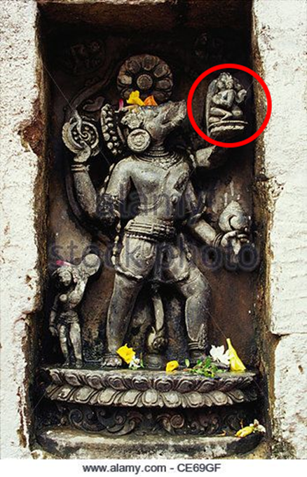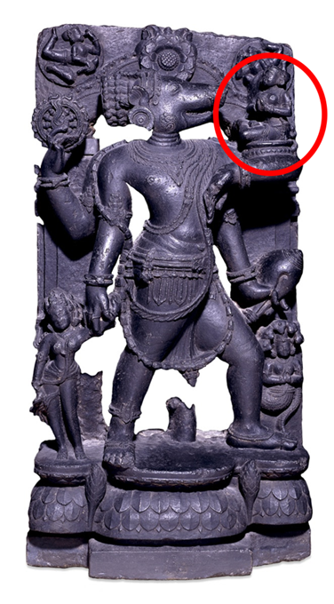 На изображении ниже мы видим изображение Бху-Варахи с Бхуми-деви, покоящейся на левой руке Варахи. Мы можем еще раз отметить, что Бхуми восседает на пьедестале, похожем на лотос.