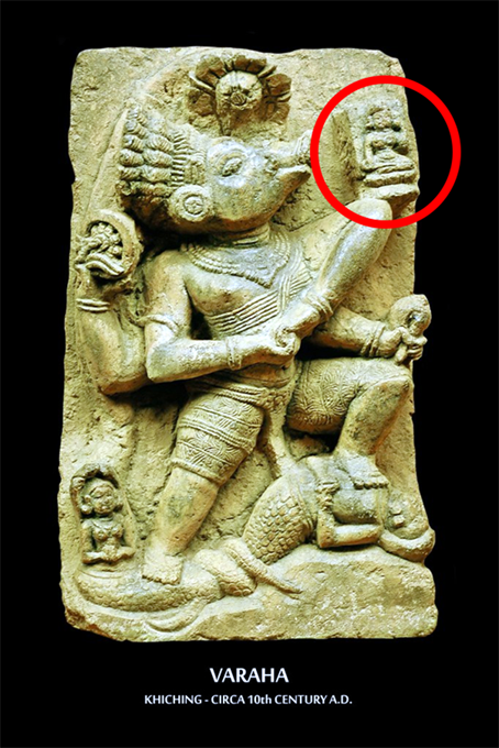 Есть много других примеров, на которые можно посмотреть, но мы никогда не найдем в классической индийской скульптуре, что персонифицированная Богиня Земли стоит на платформе в форме шара, представляющей физическую форму Земли. Обычно Земля просто удерживается в объятиях Варахи, но если включить основание, оно будет плоским, а не в форме шара. Как и в случае с индийской классической живописью, вышеупомянутые скульптуры указывают на то, что древняя ведическая культура Индии не распространяла идею о том, что Земля, поднятая Варахой, имеет форму шара.