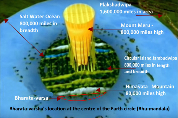 Идея о том, что ведическая культура представляла Землю как глобус, ось которого проходит между северным и южным полюсами, необоснованна, потому что Бхарата-варша (наша локальная область большой Земли) на самом деле описывается как серия островов, расположенных в южной части Джамбудвипы. Джамбудвипа является первым из семи великих островов космического размера и измеряется в 100 000 йоджан (800 000 миль); он окружен огромным океаном с соленой водой такого же размера. Джамбудвипа сравнима с “суперконтинентом”, который разделен на девять областей или варш. Бхарата-варша является одной из таких варш и расположена на южной стороне большей части суши. Наша собственная область Земли расположена в Бхарата-варше. Проще говоря, Пураны описывают Бхарата-варшу как часть более крупного земного плана, и, следовательно, нет никаких сомнений в том, что Индия вместе с другими странами мира описывается как обернутая вокруг планеты в форме шара, которая плавает в пространстве, вращаясь вокруг своей так называемой оси. На изображении ниже показано местоположение Бхарата-варши в Джамбудвипе: