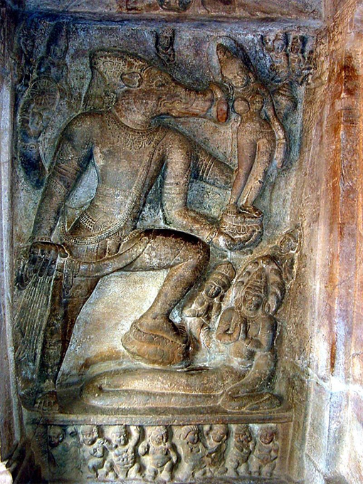 Скульптура, показанная ниже, изображает ту же эмблему Виджаянагары, но на этот раз полумесяц вырезан над носом Варахи, а сбоку изображена так называемая Земля (которая на самом деле является Солнцем). Что, если кто-то захочет использовать изображение ниже, чтобы придумать идею о том, что Вараха поднял Луну, а не Землю?