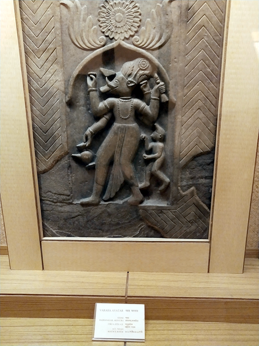 В качестве доказательства идеи о том, что древние индийцы верили, что Земля – это земной шар, Правин Мохан представляет несколько изображений Варахи, предположительно поднимающего земной шар. Вараха аватара – один из десяти аватаров Вишну, которые защищают и спасают Землю от нападений демонических существ. Вараха принимает форму гигантского кабана, и Он знаменит тем, что поднял Землю из великого космического океана, называемого Гарбходака (вода под Землей, которая заполняет нижнюю половину Брахманды или вселенского яйца). Вараха уместна здесь, потому что есть много картин и скульптур, которые изображают игру (лилу) Варахи, поднимающего Землю, и поэтому эти древние изображения дают нам представление о том, что древние индийцы думали о форме Земли, о которой идет речь. Правин Мохан представляет изображение ниже, на котором предположительно изображен Вараха, поднимающий земной шар: