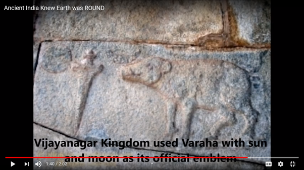 В целях представления идеи о том, что древние индийцы верили, что Земля – это земной шар, Правин Мохан показал обрезанную версию изображения, на которой показана только круглая форма так называемого земного шара; однако увеличенная рамка того же изображения показывает, что это вовсе не Земля, а скорее Солнце, вместе с полумесяцем и мечом, который вместе с Варахой образует печать / знак отличия / эмблему древней династии Виджаянагара (1336-1646).