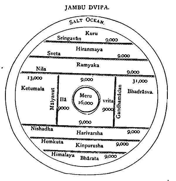 На приведенном выше изображении изображена гора Меру в центре Джамбудвипы, окруженная океаном с соленой водой, который ведет к следующему острову под названием Плакшадвипа. Шримад-Бхагаватам описывает размеры Джамбудвипы и окружающего океана следующим образом: