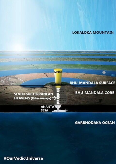Земля плоская, таково заключение Шримад-Бхагаватам. Описание семи подземных царств Бху-голы, а также расположение горы Меру и окружающих варш (регионов).