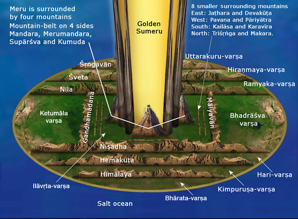 “В Джамбудвипе есть девять участков земли, каждый протяженностью 9000 йоджан [72 000 миль]. Есть восемь гор, которые обозначают границы этих подразделений и красиво разделяют их. Среди этих подразделений, или варш, находится варша по имени Илаврита, которая расположена в середине завитка лотоса. В пределах Илаврита-варши находится гора Сумеру, которая сделана из золота. Гора Сумеру подобна околоплоднику планетной системы Бху-мандала, подобной лотосу. Высота горы такая же, как ширина Джамбудвипы, или, другими словами, 100 000 йоджан [800 000 миль]. Из них 16 000 йоджан [128 000 миль] находятся внутри земли, и, следовательно, высота горы над землей составляет 84 000 йоджан [672 000 миль]. Ширина горы составляет 32 000 йоджан [256 000 миль] на ее вершине и 16 000 йоджан у ее основания”.