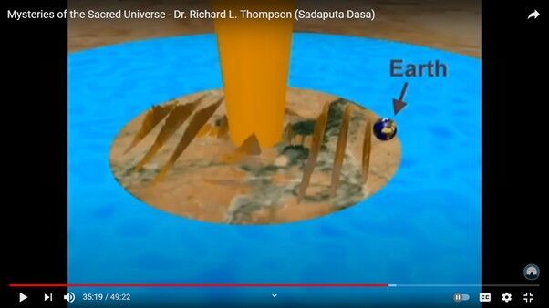В любом случае, членам ИСККОН должно быть ясно, что Храм ведического планетария представляет собой описание Вселенной согласно Шрима-Бхагаватам, и, следовательно, именно описание Земли из Шримад-Бхагаватам должно сформировать у преданных первичное представление о том, что такое Земля — ее размер, форма, и характеристики и т.д. Конкретное описание Земли в Шримад-Бхагаватам всегда является нашей отправной точкой в том, как понимать названия мест, такие как Бху-гола, гора Меру, Била-сварга и т.д. Как же тогда гора Меру может располагаться в середине так называемого земного шара, если гора Меру, о которой идет речь, описана в Шримад-Бхагаватам как имеющая высоту 100 000 йоджан? Шукадева Госвами утверждает: